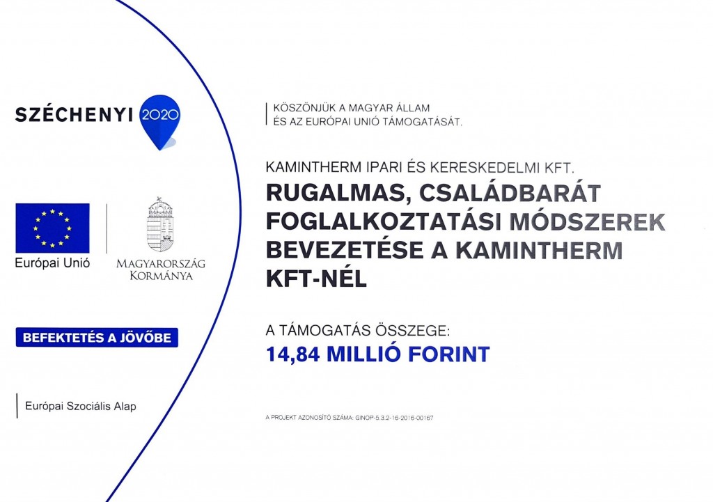 A Kamintherm KFT. a GINOP-5.3.2.-16-2016-00167 pályázati azonosító számú „A rugalmas foglalkoztatás elterjesztése a konvergencia régiókban – Rugalmas, családbarát foglalkoztatási módszerek bevezetése a Kamintherm Kft-nél” – pályázaton az alábbi célok megvalósítására nyert forrást: