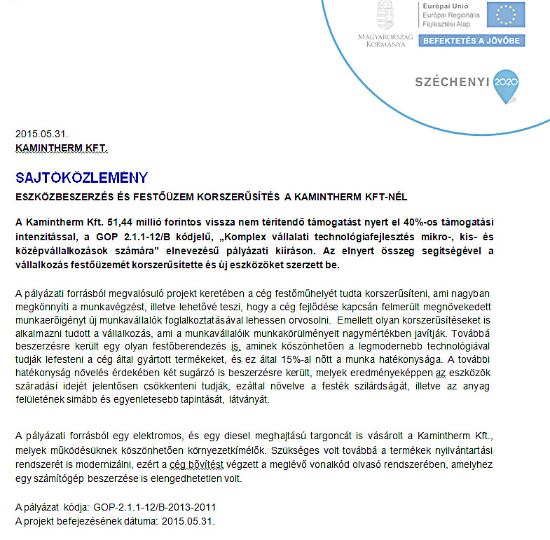 Kedvezményezett neve: KAMINTHERM Ipari és Kereskedelmi Kft.